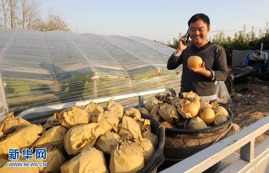 河南省首批获认证的新型职业农民的王飞在家庭农场内接听订货商的电话(11月3日摄)。网上生鲜越卖越红火;职业农民进校学营销;大豆、棉花“试水”目标价格;治山治水、为后代留一块好田……今年以来,我国农业领域悄然发生新变化,消费需求更加多样,农业“拥抱”互联网,着力改善农业生态环境,农业新鲜事给百姓生活带来了新变化。新华社记者 李安 摄