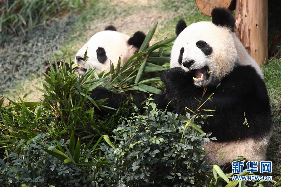 这是在吃竹叶的大熊猫“开开”和“心心”(2011年2月4日摄)。