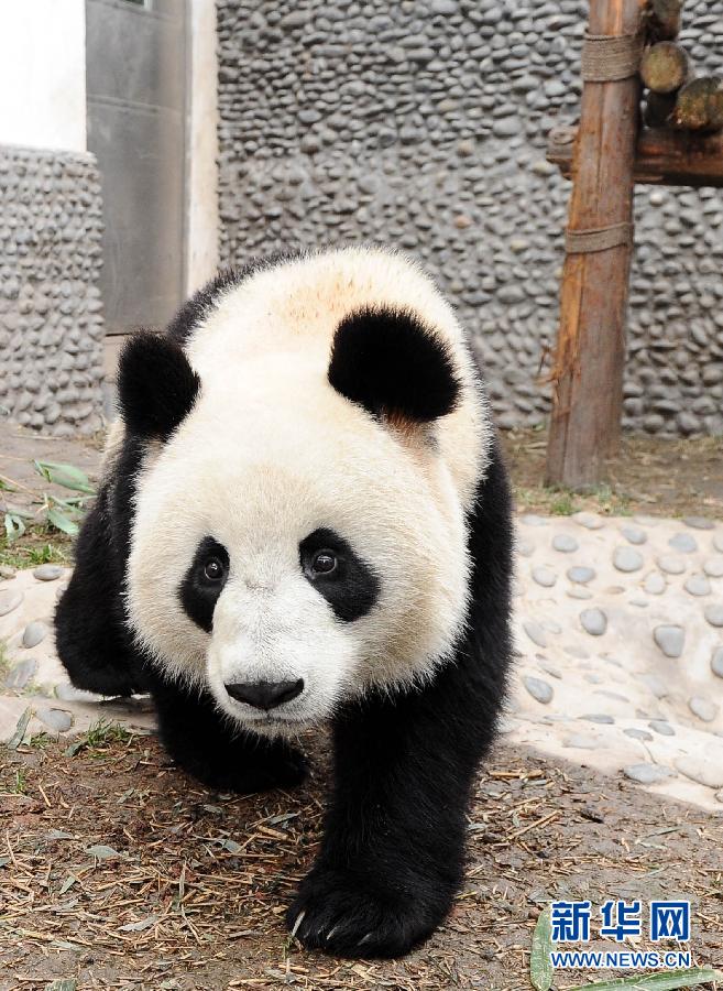 大熊猫“开开”在户外活动(2010年12月15日摄)。