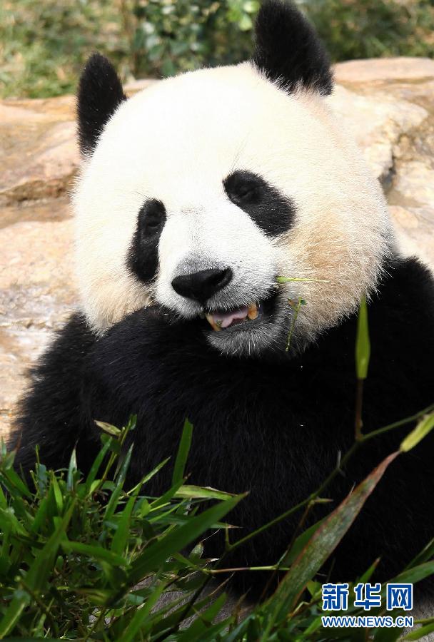这是在吃竹子的大熊猫“心心”(2011年2月4日摄)。