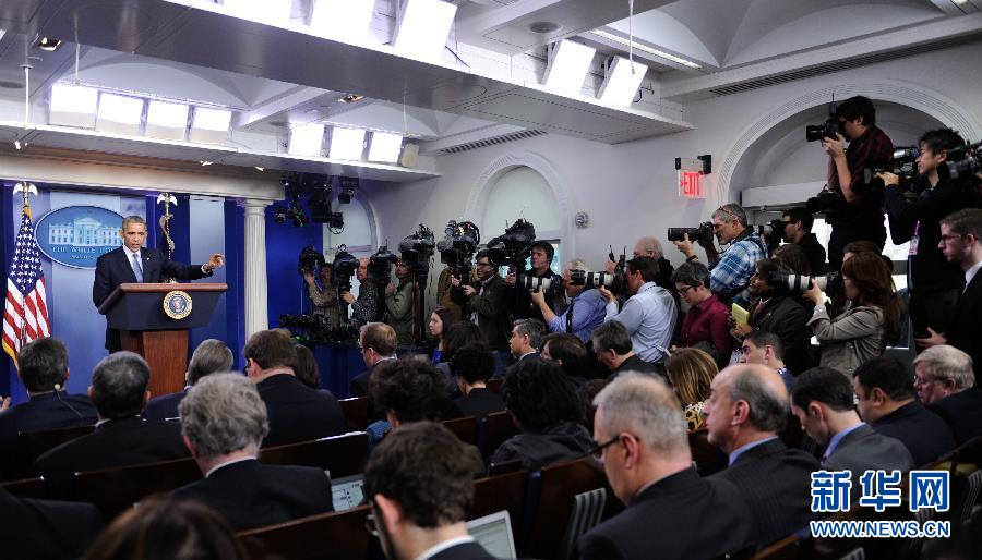 12月19日,在美国首都华盛顿,美国总统奥巴马举行年终新闻发布会。奥巴马19日在白宫举行的年终新闻发布会上表示,尽管美国和古巴已经启动关系正常化进程,但还未达到他与古巴国务委员会主席兼部长会议主席劳尔·卡斯特罗可能互访的阶段。新华社记者鲍丹丹摄