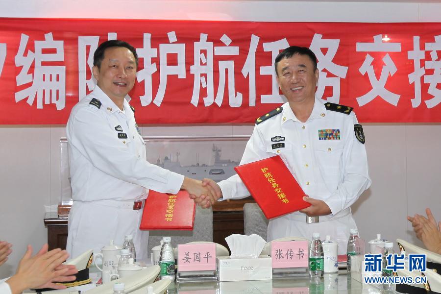 12月19日,在长白山舰会议室内,第十八批护航编队指挥员张传书(右)与第十九批护航编队指挥员姜国平进行任务交接。当地时间12月19日,中国海军第十八批护航编队长白山舰与第十九批护航编队临沂舰在亚丁湾中部海域会合,并举行了任务交接仪式。新华社记者张月琳摄
