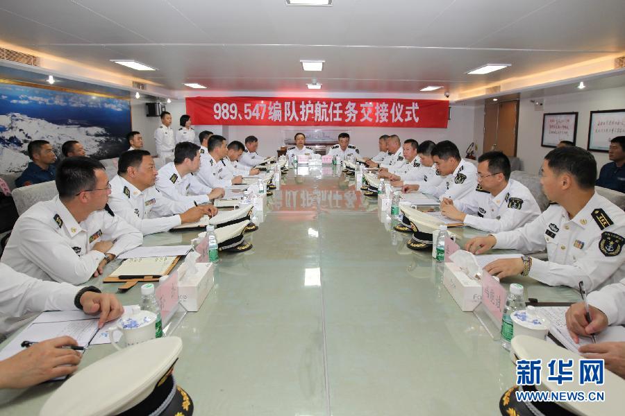 12月19日,在长白山舰会议室内,两批护航编队官兵进行任务交接。当地时间12月19日,中国海军第十八批护航编队长白山舰与第十九批护航编队临沂舰在亚丁湾中部海域会合,并举行了任务交接仪式。新华社记者张月琳摄