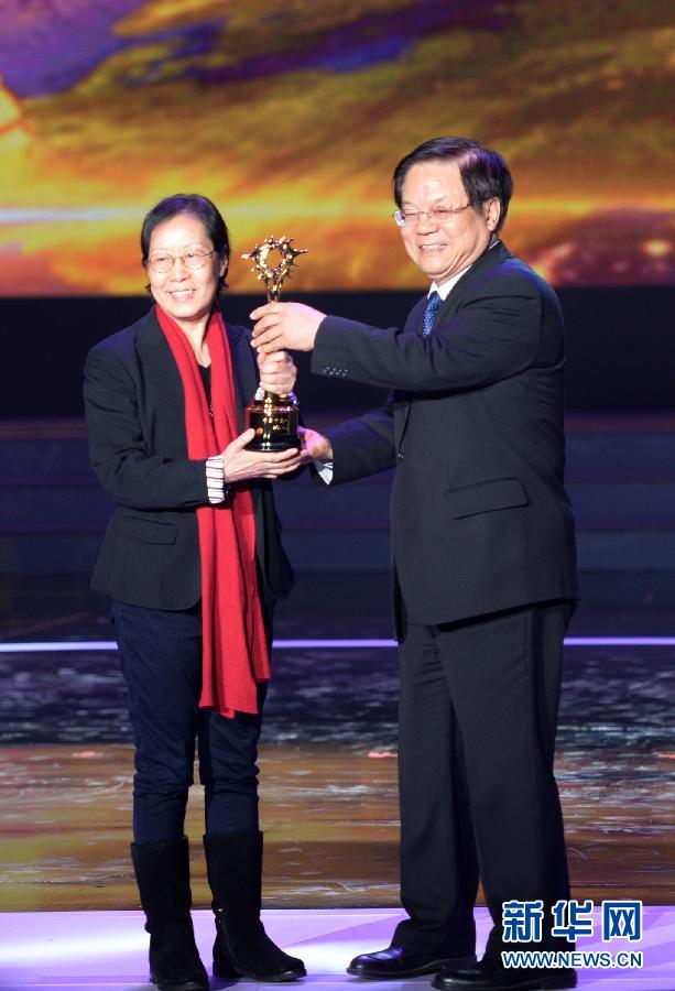12月19日,饶宗颐的女儿代表获奖人饶宗颐从文化部部长蔡武(右)手中接过奖杯。当日,“中华之光——传播中华文化年度人物”颁奖典礼在北京举行。据介绍,“中华之光——传播中华文化年度人物”评选活动由文化部、国务院新闻办、国务院侨办、中国人民对外友好协会等单位共同主办,每年举办一次,每次评选出10名“传播中华文化年度人物”和一个集体奖。新华社记者 陈晔华 摄