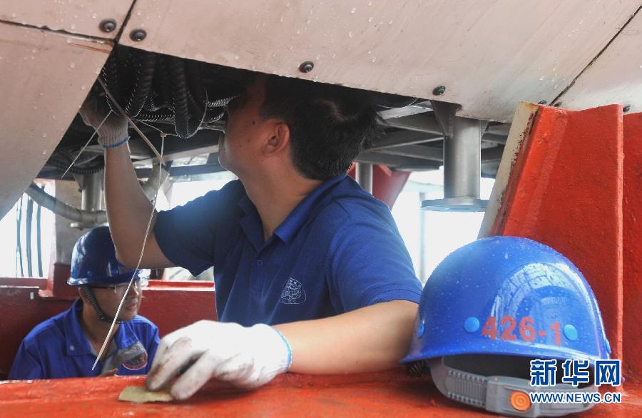 12月19日,在搭载着“蛟龙”号载人潜水器的“向阳红09”母船上,科考队员正在检查潜水器。 “蛟龙”号载人潜水器正在西南印度洋执行2014年至2015年“蛟龙”号试验性应用航次(中国大洋35航次)第二和第三航段科考任务,计划于12月23日在印度洋首次下潜。科考队员利用航渡时间抓紧做好潜水器各项检查和准备。新华社记者张旭东摄