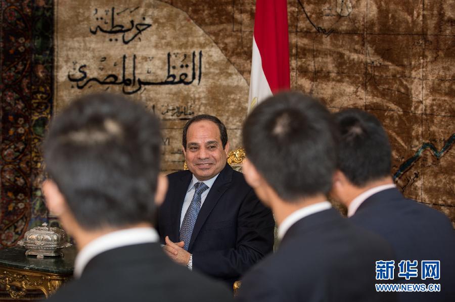 12月18日,在埃及首都开罗,埃及总统阿卜杜勒—法塔赫·塞西(中)在总统府接受中国媒体采访。埃及总统阿卜杜勒—法塔赫·塞西18日接受新华社等中国媒体采访时表示,埃及希望巩固和深化与中国的友好合作,进一步发展战略合作关系,并从中国的发展成就中汲取经验。新华社记者潘超越摄