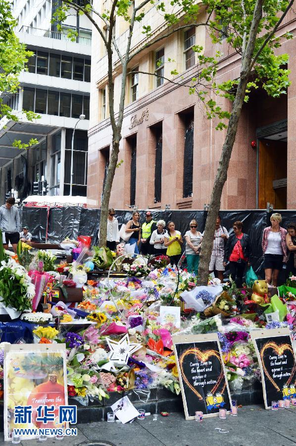 12月19日,在澳大利亚悉尼,人们为咖啡馆人质劫持事件遇难者献花。连日来,民众纷纷来到悉尼发生人质劫持事件的咖啡馆外献花,悼念遇难者。 新华社记者金林鹏摄