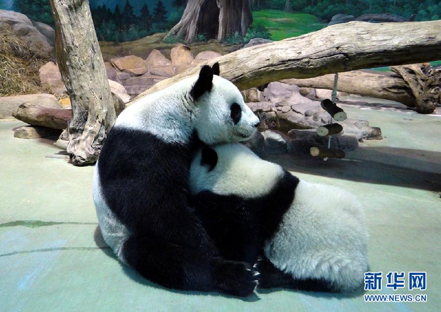 12月18日,大熊猫“圆仔”(右)向妈妈“圆圆”讨奶喝。