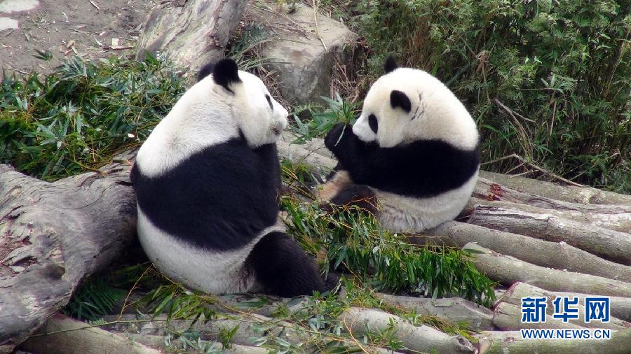 12月18日,大熊猫“圆仔”(右)和妈妈“圆圆”一起吃竹叶。