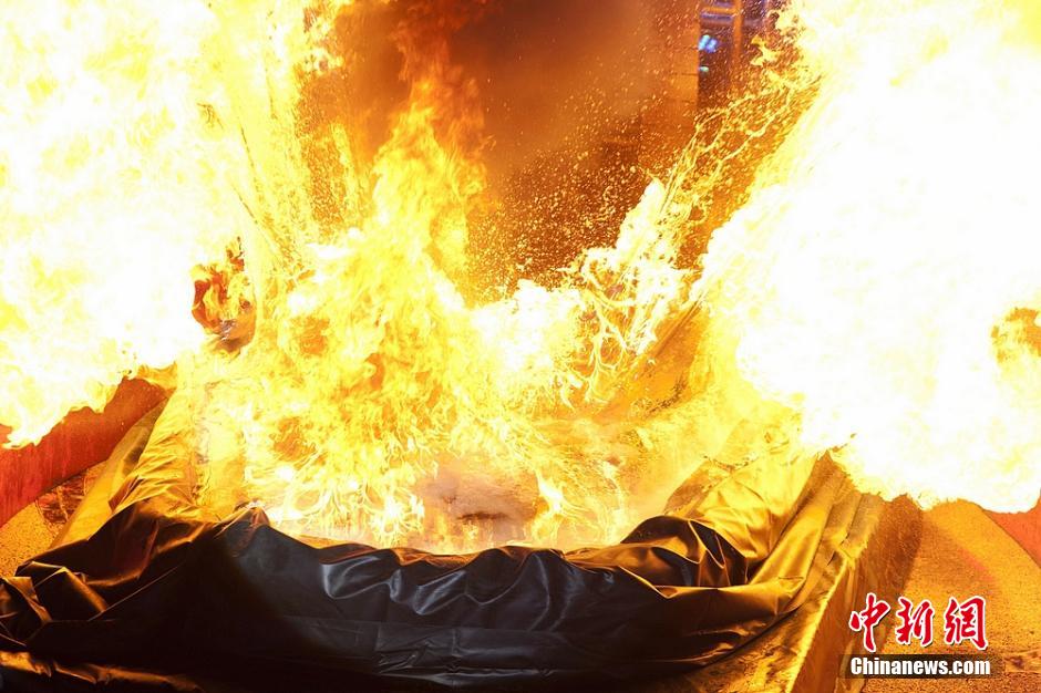 12月19日晚,一场惊心动魄的高空浅池极限跳水活动在长沙上演。53岁的美国人达伦·泰勒挑战人体极限,从9米高的跳台成功跃入仅29厘米深的水池,且池面铺满汽油,并燃起烈火。杨华峰 摄