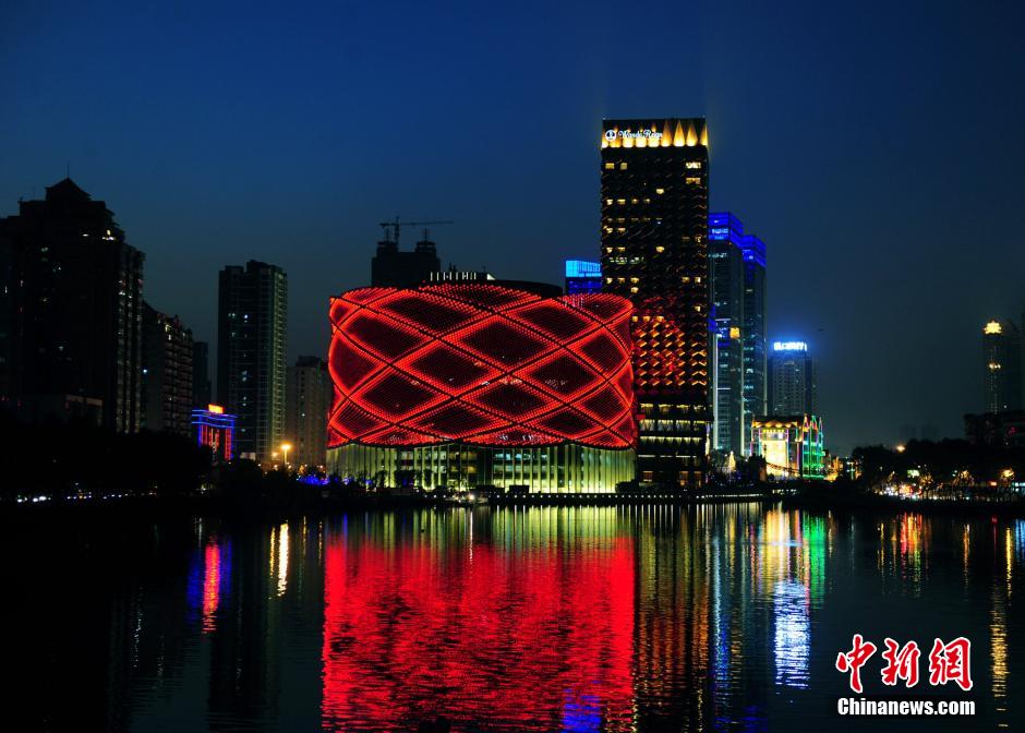 12月19日,夜幕下的武汉楚河汉街,红灯笼造型的汉秀剧场分外夺目。武汉楚河汉街东、西两端两个世界级项目——汉秀剧场、万达电影乐园将与明天同日开幕。汉秀剧场建筑高71.6米,总建筑面积8.6万平方米,是世界上最大的以“红灯笼”为造型的建筑。该剧场由万达集团与世界闻名的美国弗兰克演艺公司合作,投资数十亿元建设。“汉秀”是集国际顶尖科技、人体极限表演和中国传统文化于一体的世界顶级舞台秀。中新社发 张畅 摄