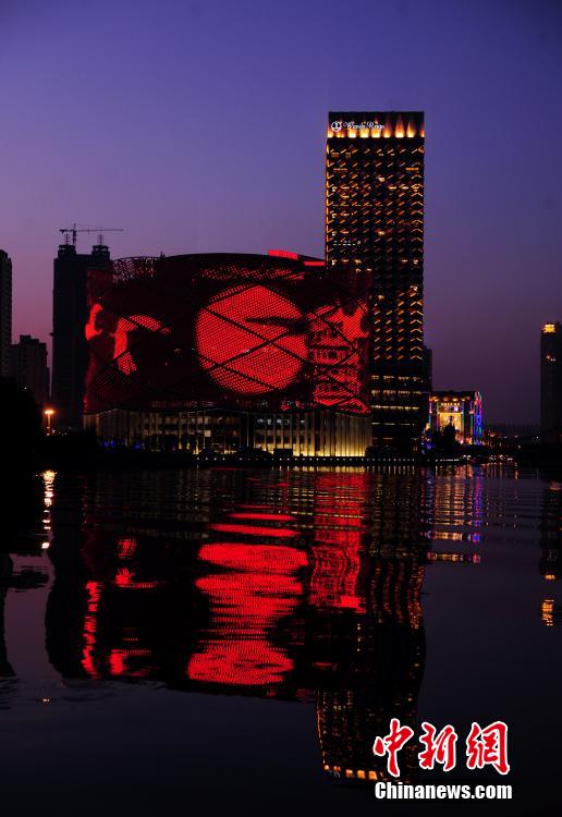 12月19日,夜幕下的武汉楚河汉街,红灯笼造型的汉秀剧场分外夺目。武汉楚河汉街东、西两端两个世界级项目——汉秀剧场、万达电影乐园将与明天同日开幕。汉秀剧场建筑高71.6米,总建筑面积8.6万平方米,是世界上最大的以“红灯笼”为造型的建筑。该剧场由万达集团与世界闻名的美国弗兰克演艺公司合作,投资数十亿元建设。“汉秀”是集国际顶尖科技、人体极限表演和中国传统文化于一体的世界顶级舞台秀。中新社发 张畅 摄