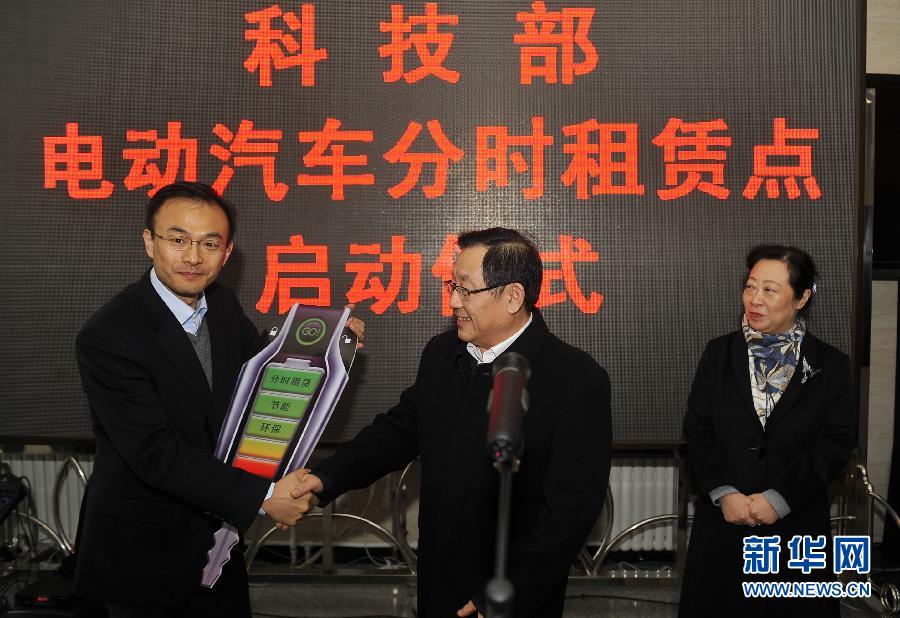 12月18日,“绿狗公务车”品牌代表(左)向科技部代表移交电动汽车钥匙模型,标志科技部电动汽车分时租赁点正式启动。当日,科技部电动汽车分时租赁点正式启动投入使用。为推进公务用车制度改革,倡导节能环保理念,满足员工公务出行需求,科技部在办公区域内率先建立电动汽车分时租赁点,首批引进10辆北京一家新能源汽车租赁公司旗下的对公电动汽车分时租赁服务品牌“GREENGO 绿狗公务车”。 新华社记者鲁鹏摄