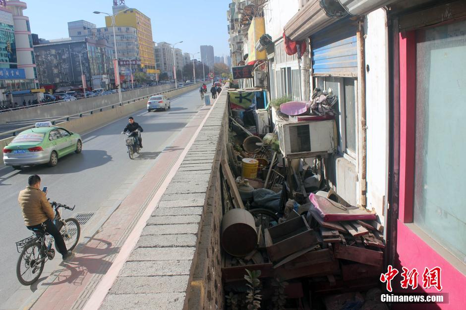 记者在现场看到,这堵临街围墙内,虽多数商铺搬离,但破损、杂乱的广告门牌仍临街而立。还有商铺在隔墙营业。市民李先生认为,修筑这样一堵围墙,本身是环境看起来更整洁,但谁知道给了小广告以可趁之机,再加上随意涂抹的清理方式,弄得这面墙成了“大花脸”。图为郑州市文化路与东风路西北角一堵百余米的围墙内,内废弃物、垃圾随意堆积,无人清理。 马义恒 摄