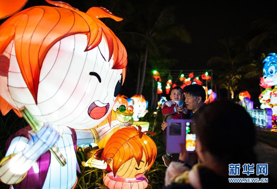 12月18日,市民在深圳欢乐海岸椰林沙滩动漫灯会上参观。当日,深圳首届动漫灯会在深圳欢乐海岸椰林沙滩开幕。这次灯会将传统彩灯与时尚、科技、动漫等新元素进行融合,推出50余组巨型灯组,200多个卡通形象。据悉,此次灯会将持续至2015年3月10日。新华社记者毛思倩摄
