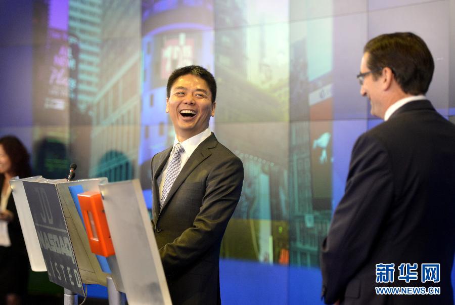 2014年5月22日,京东集团创始人兼首席执行官刘强东(左)在美国纽约纳斯达克交易所参加上市发布活动。当天,中国最大的自营式电商企业——京东集团在美国纳斯达克证券交易所挂牌交易。新华社记者王雷摄(翟希编辑)