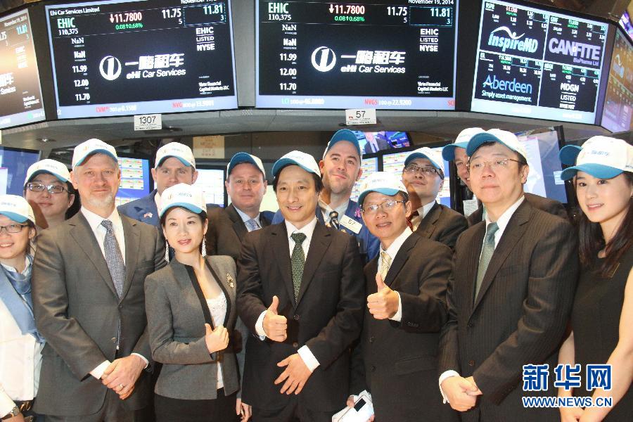 2014年11月19日,一嗨汽车租赁公司首席执行官兼创始人章瑞平(前排中)和公司管理层在美国纽约证券交易所合影。中国汽车租赁和专车服务提供商一嗨汽车服务有限公司11月18日登陆美国纽约证券交易所。新华社记者黄继汇摄(翟希编辑)