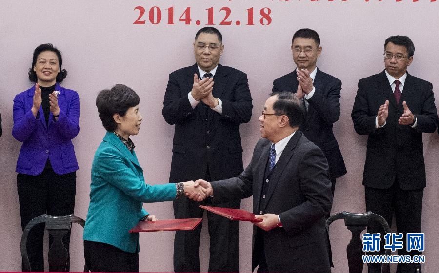 12月18日,商务部副部长高燕(前左)与澳门特区经济财政司司长谭伯源(前右)在签约仪式上。当日,《关于内地在广东与澳门基本实现服务贸易自由化的协议》在澳门签署,协议将在2015年3月1日起正式实施。 新华社记者 吕小炜 摄