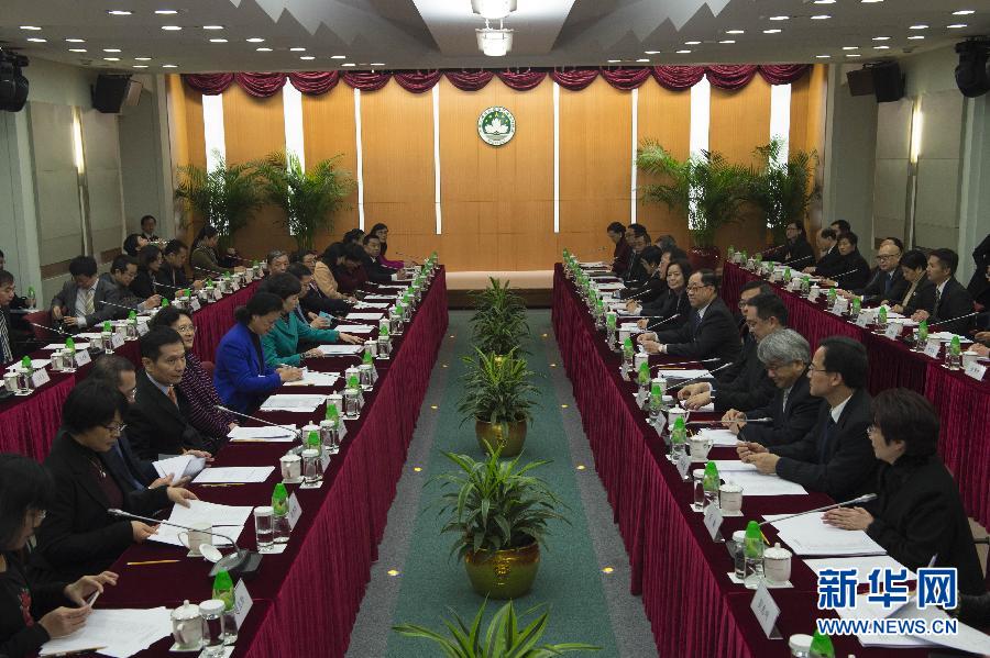 这是12月18日拍摄的签约前的会议现场。当日,《关于内地在广东与澳门基本实现服务贸易自由化的协议》在澳门签署,协议将在2015年3月1日起正式实施。 新华社记者 吕小炜 摄