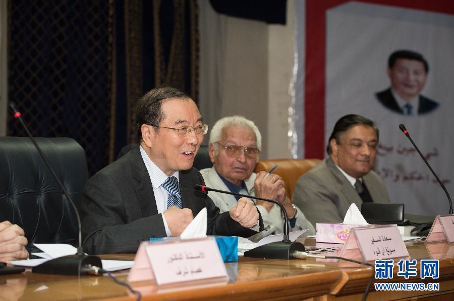 12月17日,在埃及首都开罗,中国驻埃及大使宋爱国(前)在《习近平谈治国理政》一书推介会上发言。当日,《习近平谈治国理政》一书推介会在埃及记者工会举办,与会的埃及政界、学术界代表对该书进行了热烈探讨并给予高度评价。新华社记者潘超越摄