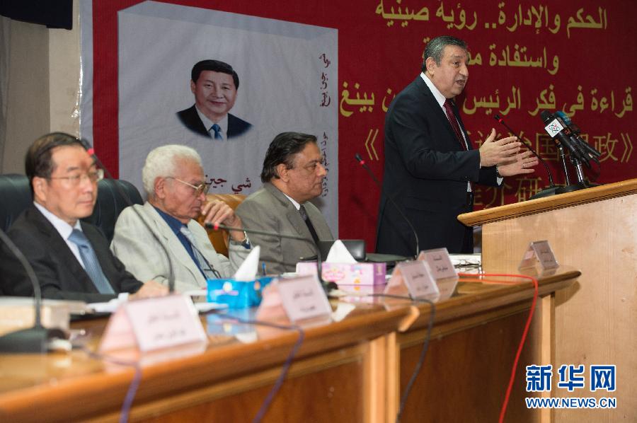 12月17日,在埃及首都开罗,埃及前总理埃萨姆·谢拉夫(右一)在《习近平谈治国理政》一书推介会上致辞。当日,《习近平谈治国理政》一书推介会在埃及记者工会举办,与会的埃及政界、学术界代表对该书进行了热烈探讨并给予高度评价。新华社记者潘超越摄