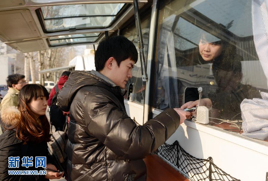 12月18日,一名学生在北京邮电大学校园内的流动售票车窗口取票。为方便高校学生取票,北京铁路局开出流动售票车深入部分校园,为学生提供送票上门服务。学生也可就近选择车站窗口、自助售票机、火车票代售点付款取票。据了解,北京铁路局集中优先为大学生办理2015年1月15日至2月10日期间的往程学生团体票和2015年3月1日至3月15日期间的返程学生团体票,确保大学生能及时回家和返校。北京铁路局今年集中受理大学生订票约2.1万张,首次采取学校集中办理,学生分散单独取票的方式。从2014年12月16日8时到12月22日20时,学生均可自主确认支付和取票时间。新华社记者 陈晔华 摄