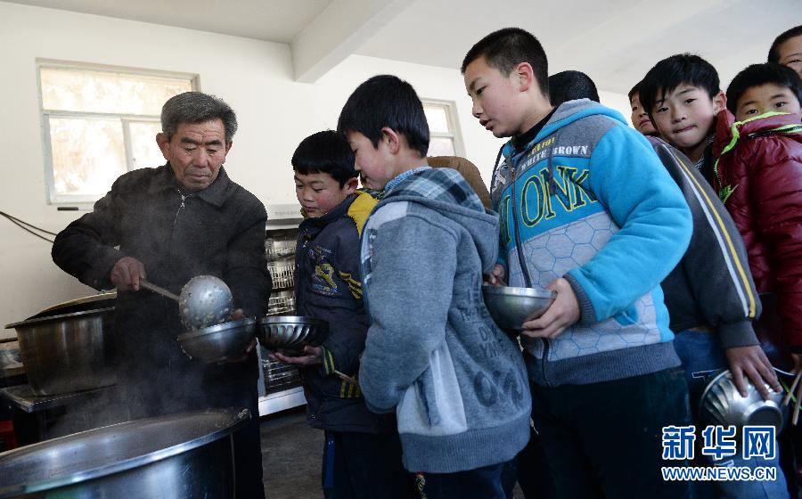 晚餐时,马维帅给孩子们打饭(12月16日摄)。在国家级贫困县陕西子洲县的深山里,有一所远近闻名的民办学校——周硷镇马塔留守儿童学校。创办人马维帅举债坚持办学,又因为在家排行老三,被当地人戏称为“憨马三”。马塔自然村距离县城40多公里,村民祖祖辈辈靠天吃饭。1992年,村里小学停办,马维帅便和村里两名有办学意向的村民一起自己动手建学校。由于资金短缺办学艰难,合伙人1995年相继退出。马维帅说:“我这个人乐观,不管日子多苦,从来没想过关闭学校。”学校自开办之初,便吸引来周围十里八村的学生,也因为他的坚持,逐步得到社会各界的关注和支持。从2006年起,学校运营情况有所好转,学生们更是接连获得全县统考的好名次。如今,马塔留守儿童学校依然保持着每年200名左右的学生,其中90%为留守儿童。新华社记者 刘潇摄
