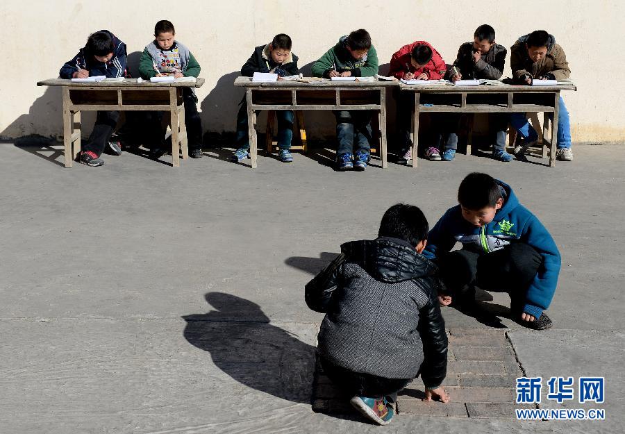 中午,学生们在屋外写作业、玩弹珠(12月17日摄)。在国家级贫困县陕西子洲县的深山里,有一所远近闻名的民办学校——周硷镇马塔留守儿童学校。创办人马维帅举债坚持办学,又因为在家排行老三,被当地人戏称为“憨马三”。马塔自然村距离县城40多公里,村民祖祖辈辈靠天吃饭。1992年,村里小学停办,马维帅便和村里两名有办学意向的村民一起自己动手建学校。由于资金短缺办学艰难,合伙人1995年相继退出。马维帅说:“我这个人乐观,不管日子多苦,从来没想过关闭学校。”学校自开办之初,便吸引来周围十里八村的学生,也因为他的坚持,逐步得到社会各界的关注和支持。从2006年起,学校运营情况有所好转,学生们更是接连获得全县统考的好名次。如今,马塔留守儿童学校依然保持着每年200名左右的学生,其中90%为留守儿童。新华社记者 刘潇摄