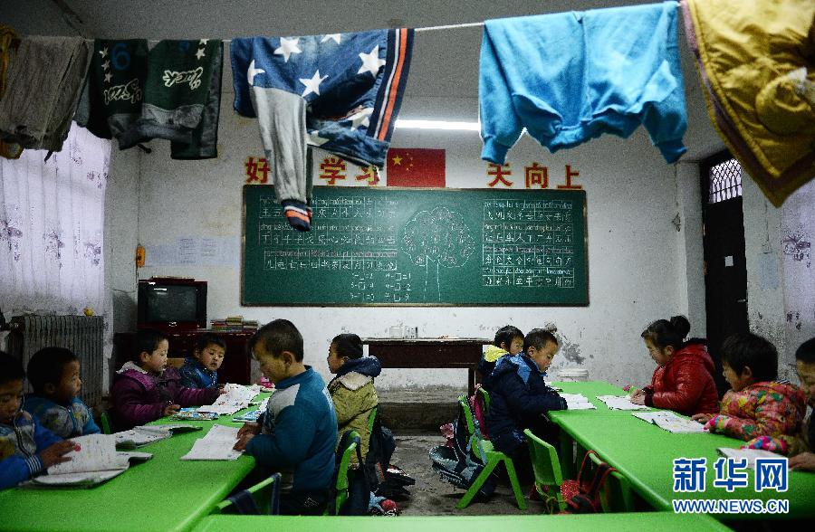 学前班的孩子们在进行早读,因为屋外寒冷,孩子们的衣服清洗后都挂在教室里(12月17日摄)。在国家级贫困县陕西子洲县的深山里,有一所远近闻名的民办学校——周硷镇马塔留守儿童学校。创办人马维帅举债坚持办学,又因为在家排行老三,被当地人戏称为“憨马三”。马塔自然村距离县城40多公里,村民祖祖辈辈靠天吃饭。1992年,村里小学停办,马维帅便和村里两名有办学意向的村民一起自己动手建学校。由于资金短缺办学艰难,合伙人1995年相继退出。马维帅说:“我这个人乐观,不管日子多苦,从来没想过关闭学校。”学校自开办之初,便吸引来周围十里八村的学生,也因为他的坚持,逐步得到社会各界的关注和支持。从2006年起,学校运营情况有所好转,学生们更是接连获得全县统考的好名次。如今,马塔留守儿童学校依然保持着每年200名左右的学生,其中90%为留守儿童。新华社记者 刘潇摄
