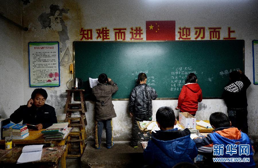 五年级的学生在上晚自习(12月16日摄)。在国家级贫困县陕西子洲县的深山里,有一所远近闻名的民办学校——周硷镇马塔留守儿童学校。创办人马维帅举债坚持办学,又因为在家排行老三,被当地人戏称为“憨马三”。马塔自然村距离县城40多公里,村民祖祖辈辈靠天吃饭。1992年,村里小学停办,马维帅便和村里两名有办学意向的村民一起自己动手建学校。由于资金短缺办学艰难,合伙人1995年相继退出。马维帅说:“我这个人乐观,不管日子多苦,从来没想过关闭学校。”学校自开办之初,便吸引来周围十里八村的学生,也因为他的坚持,逐步得到社会各界的关注和支持。从2006年起,学校运营情况有所好转,学生们更是接连获得全县统考的好名次。如今,马塔留守儿童学校依然保持着每年200名左右的学生,其中90%为留守儿童。新华社记者 刘潇摄