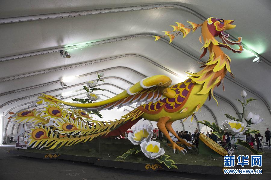 12月19日,即将参加2015年新年玫瑰花车游行的中国花车在美国洛杉矶玫瑰碗体育场边亮相。这一花车由洛杉矶华人企业诚保利集团投资打造,主题为“光明的未来”。已有125年历史的帕萨迪纳新年玫瑰花车游行是美国最重要的新年庆祝活动之一,每年吸引数十万人现场观看,全球有100多个国家和地区转播游行盛况。新华社记者杨磊摄