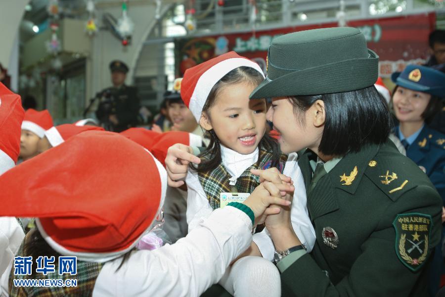 12月18日,驻港部队官兵与小朋友在一起做游戏。当日,解放军驻港部队官兵代表前往香港上水惠州幼稚园分校和耆康会关泉护理安老院开展“慰老爱幼”活动。 新华社记者陈思涵摄