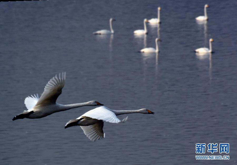 12月14日,两只白天鹅贴着湖面飞翔。新华社记者 王颂 摄