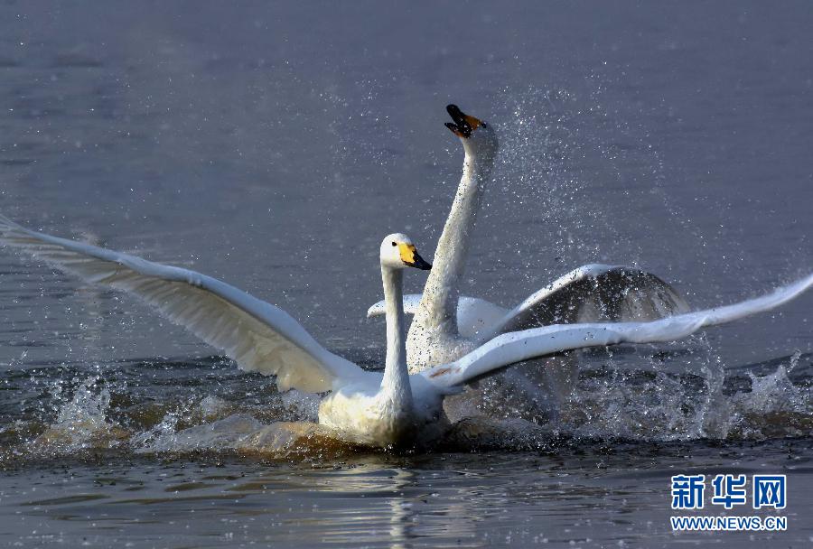 12月14日,两只白天鹅在湖面上嬉戏。新华社记者 王颂 摄