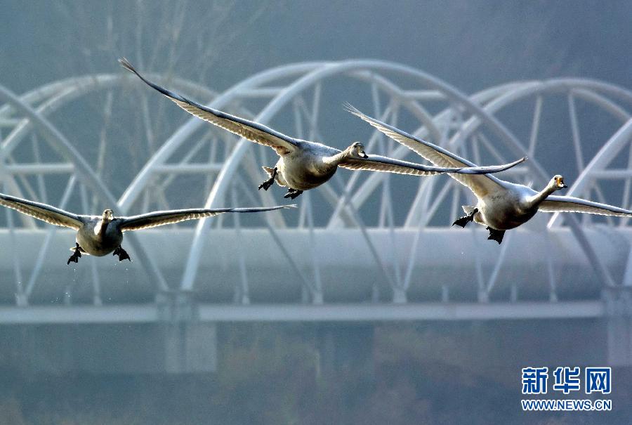 12月14日,三只白天鹅从三门峡市内的一座桥梁前飞过。新华社记者 王颂 摄