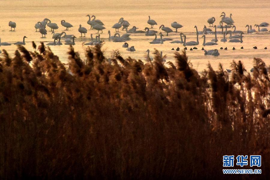 12月14日,一群白天鹅在芦苇包围的水面上栖息。新华社记者 王颂 摄