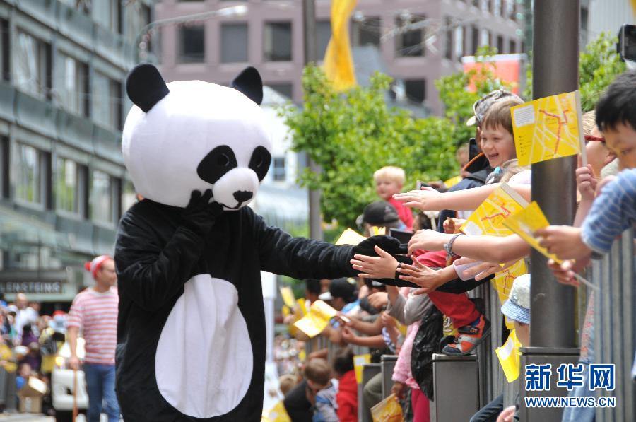 12月14日,在新西兰首都惠灵顿,中国青年政治学院学生艺术团成员装扮成大熊猫与市民互动。