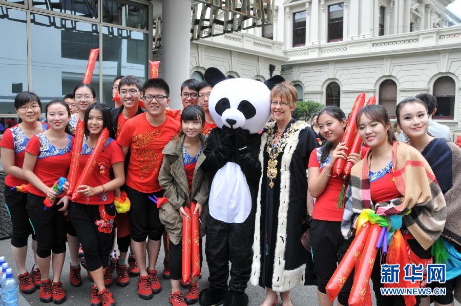 12月14日,在新西兰首都惠灵顿,惠灵顿市长西莉亚·韦德布朗(右四)在圣诞巡游开始前与中国青年政治学院学生艺术团合影。新华社记者宿亮摄