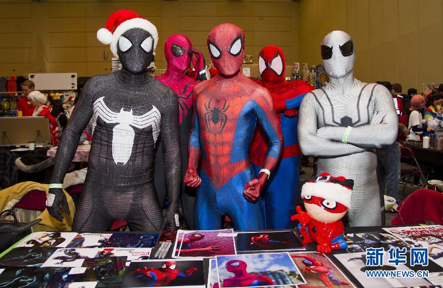 12月14日,在加拿大多伦多,几名男子在自己的摊位上展示造型以吸引顾客。当日,加拿大多伦多举办2014年动漫展,动漫作品、玩具模型以及卡通形象造型展示等内容吸引了众多爱好者。 新华社发(邹峥摄)