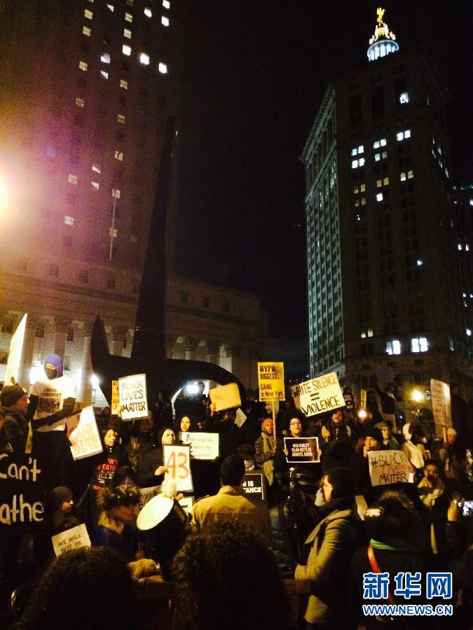 12月13日,在美国纽约曼哈顿,人们参加游行示威(手机拍摄)。美国首都华盛顿、纽约以及波士顿等地13日再次爆发大规模示威活动,上万人走上街头,游行抗议弗格森枪击案等事件背后的种族歧视和司法不公。新华社发(谷星楠摄)