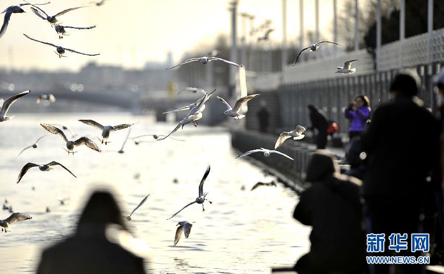 12月20日,市民在海河刘庄桥附近的岸边观看红嘴鸥。近日,近三百余只迁徙中的红嘴鸥在天津海河沿线驻足休息,吸引了许多摄影爱好者和市民。 新华社记者岳月伟摄