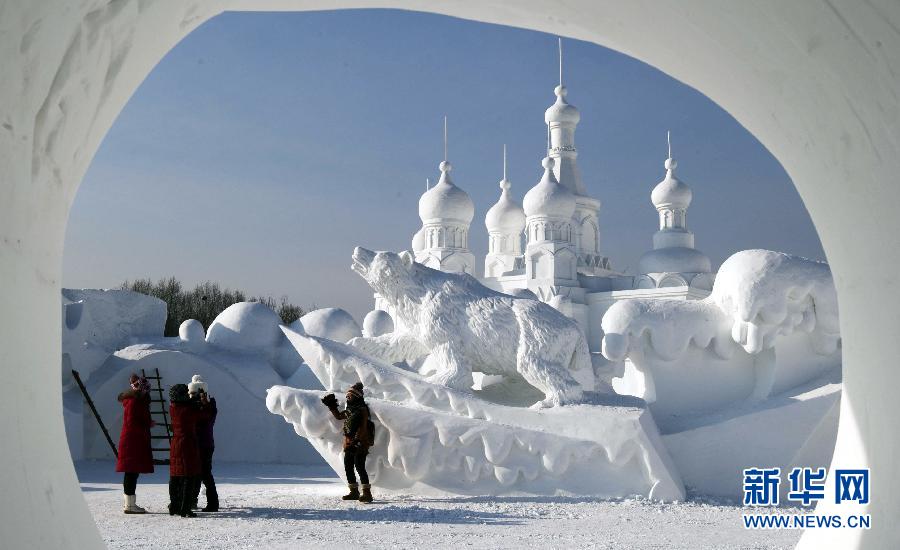 这是12月17日拍摄的太阳岛国际雪雕博览会大型雪塑《绽放》(局部)。新华社发(李毅 摄)