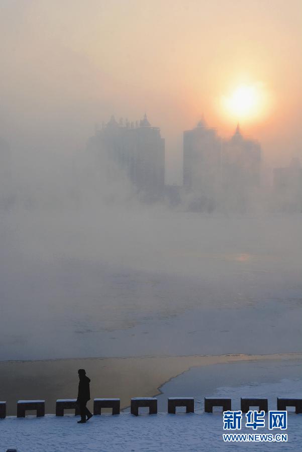 12月17日,在吉林省吉林市松花江畔,行人在水雾蒸腾的江边行走。 当日,受冷空气影响,吉林省吉林市最低温度降低到-26℃ ,松花江上雾气蒸腾,景色迷人,犹如人间仙境。 新华社发(王明铭 摄)