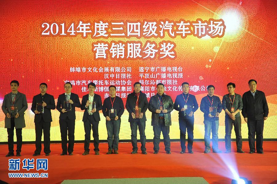 12月17日,荣获“2014年度三四级汽车市场营销服务奖”的机构代表登台领奖。当日,由中国机械工业联合会、中国汽车报社、中国汽车新闻工作者协会及百强巡展系列活动组委会联合举办的“中国汽车三四级市场创新发展大会暨2014百强巡展系列活动年会”在北京举行。来自政府相关部门、行业专家、汽车厂商等多方代表,围绕国内汽车消费三四级市场的相关问题展开广泛交流和探讨。新华社记者鲁鹏摄