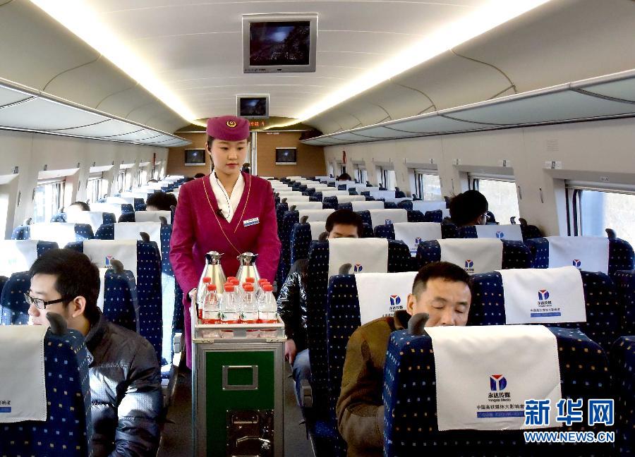 12月17日,郑开城际铁路乘务员在旅途中为乘客服务。新华社记者 李安 摄