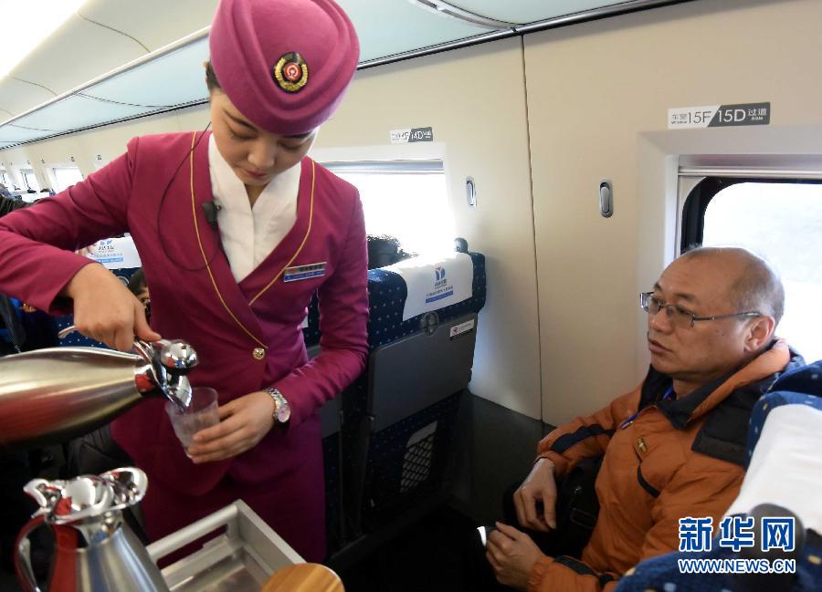 12月17日,郑开城际铁路乘务员在旅途中为试乘乘客服务。 新华社记者 王颂 摄