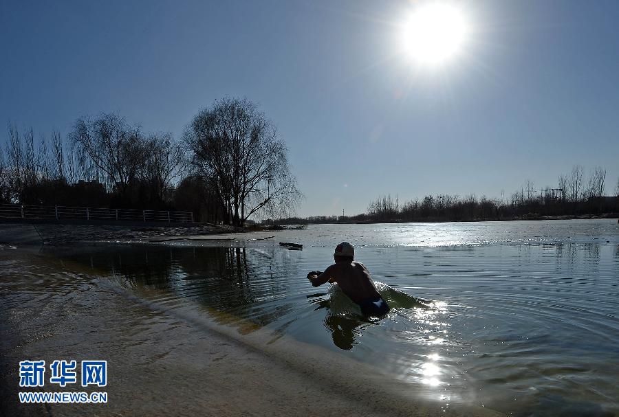 近日,随着气温逐渐下降,银川的老年冬泳爱好者们开始活跃在湖泊、河流,在刺骨的寒风中享受冬泳带来的挑战和快乐。图为一位冬泳爱好者在冰水中游泳(12月15日摄)。 新华社记者王鹏摄