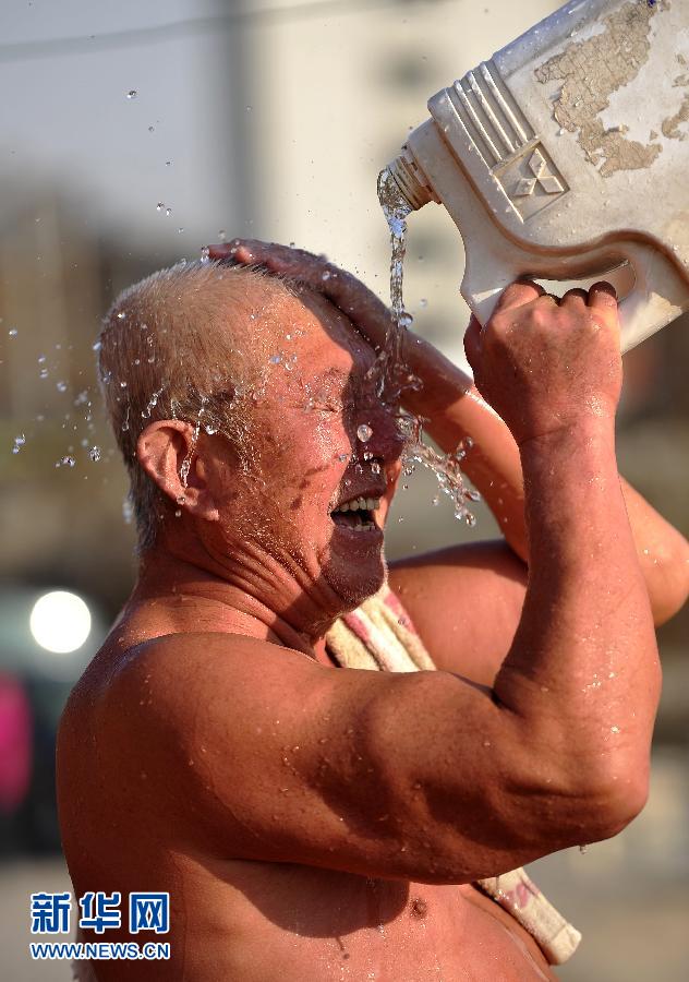 近日,随着气温逐渐下降,银川的老年冬泳爱好者们开始活跃在湖泊、河流,在刺骨的寒风中享受冬泳带来的挑战和快乐。图为一位冬泳爱好者在冬泳结束后冲洗头部(12月15日摄)。 新华社记者王鹏摄