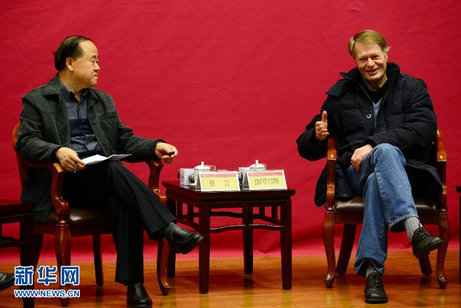 12月16日,莫言(左)与法国诺贝尔文学奖获得者勒克莱齐奥出席山东大学“文学大讲堂”活动。当日,山东大学“文学大讲堂”第三期邀请了中法两国诺贝尔文学奖获得者莫言与勒克莱齐奥齐聚一堂,畅谈“文学与人生”。 新华社发(赵晓明摄)