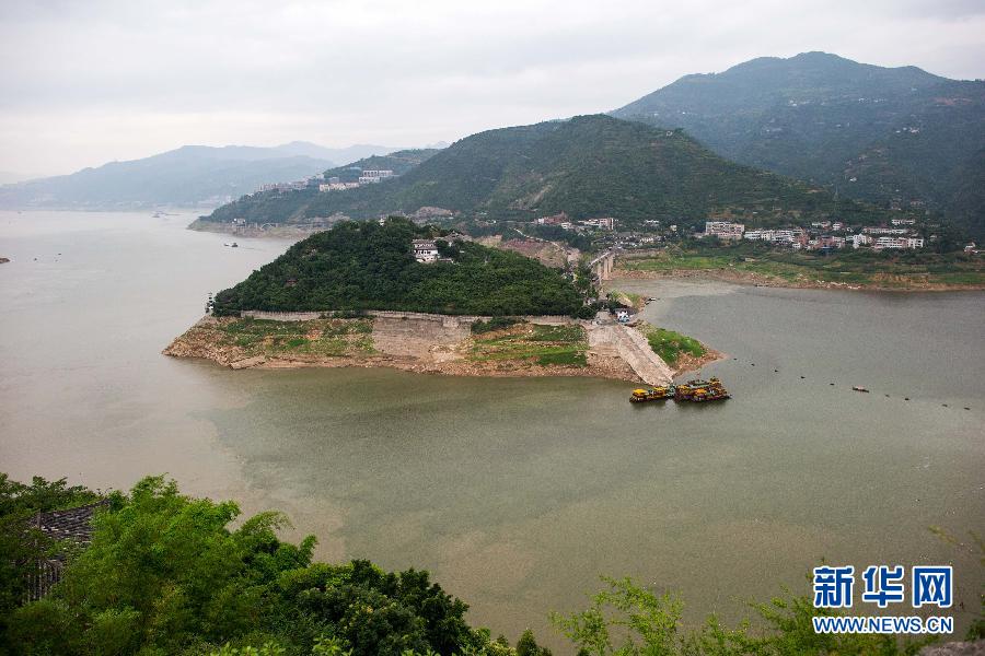 经过治理之后,重庆奉节白帝城景区的消落带区域已隐约可见部分绿色(2014年6月24日摄)。